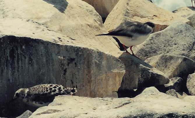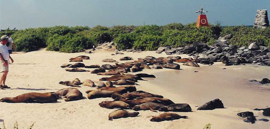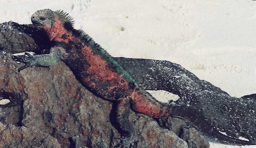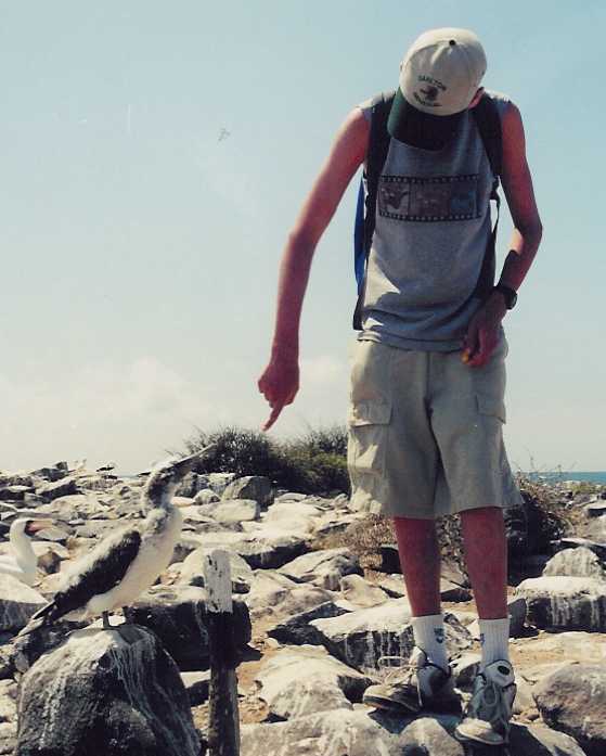 On the beach are sea lions, crabs, pelicans, iguanas, and very friendly mockingbirds. The mockingbirds are looking for water. Pelicans fly and dive amongst the swimmers. After an hour and a half or so, we go for our last snorkeling trip around Turtle Island - which does in fact look like a turtle - king angel fish, trumpet fish, sea stars, and many others. The fins that are too small and the waves at one end of the rock a little frustrate me. This is probably the clearest water that we've snorkeled in and it's best right when we start.
