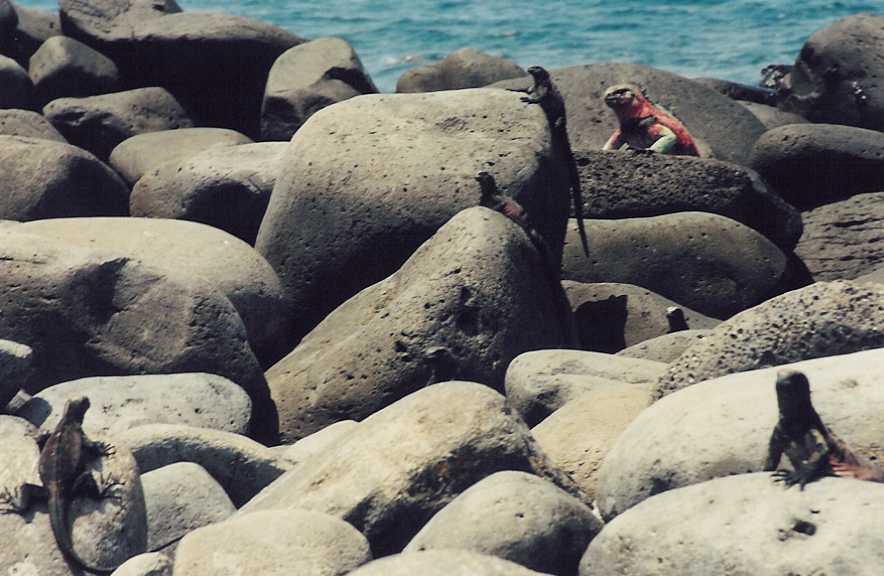 Our last walk is along the top of lava cliffs where masked boobies nest. We see lots of chicks, including one dead one and one that Raul saw being born last week. We also see a Swallow Tailed Gull Chick. The iguanas here are in full color and there are lots of babies. Sea Lions abound. We also see mocking birds and frigates.
