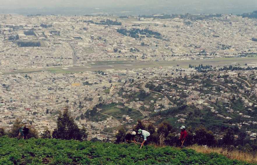 The path becomes considerably steeper now. After climbing quite a bit, we come out near a horse corral with a potato field right below it that workers are actively tilling. There is a house even further up the ridge. I can see a panorama of Quito including the airport - which has development all around it. Jorge tells me we are at 3350m (11,000 ft.).